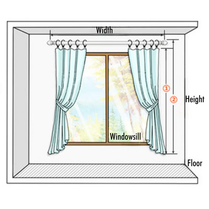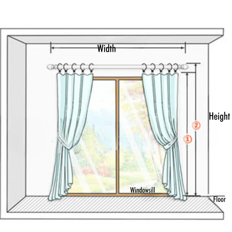 2. Partial floor to ceiling curtains effect: width of the window length + left and right each 9'', high from the ceiling height from the ground each +4'' to 6''
